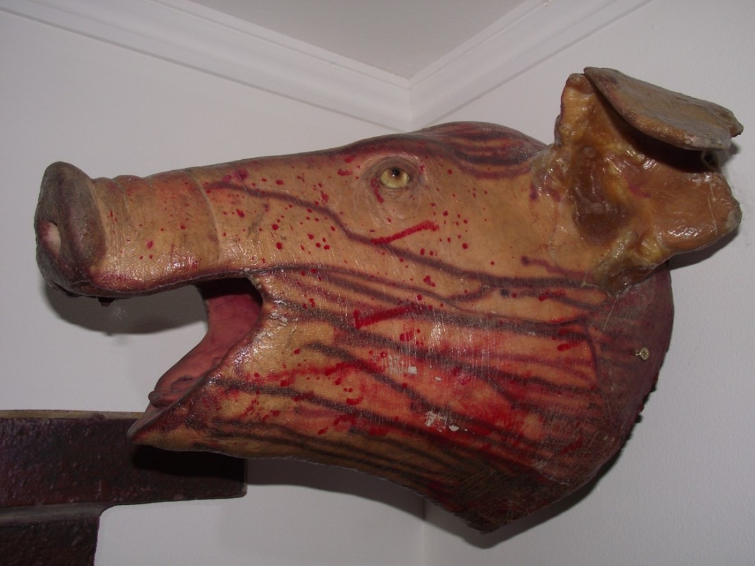 A life size, butchered swine's head with gaping mouth with realistic tongue.